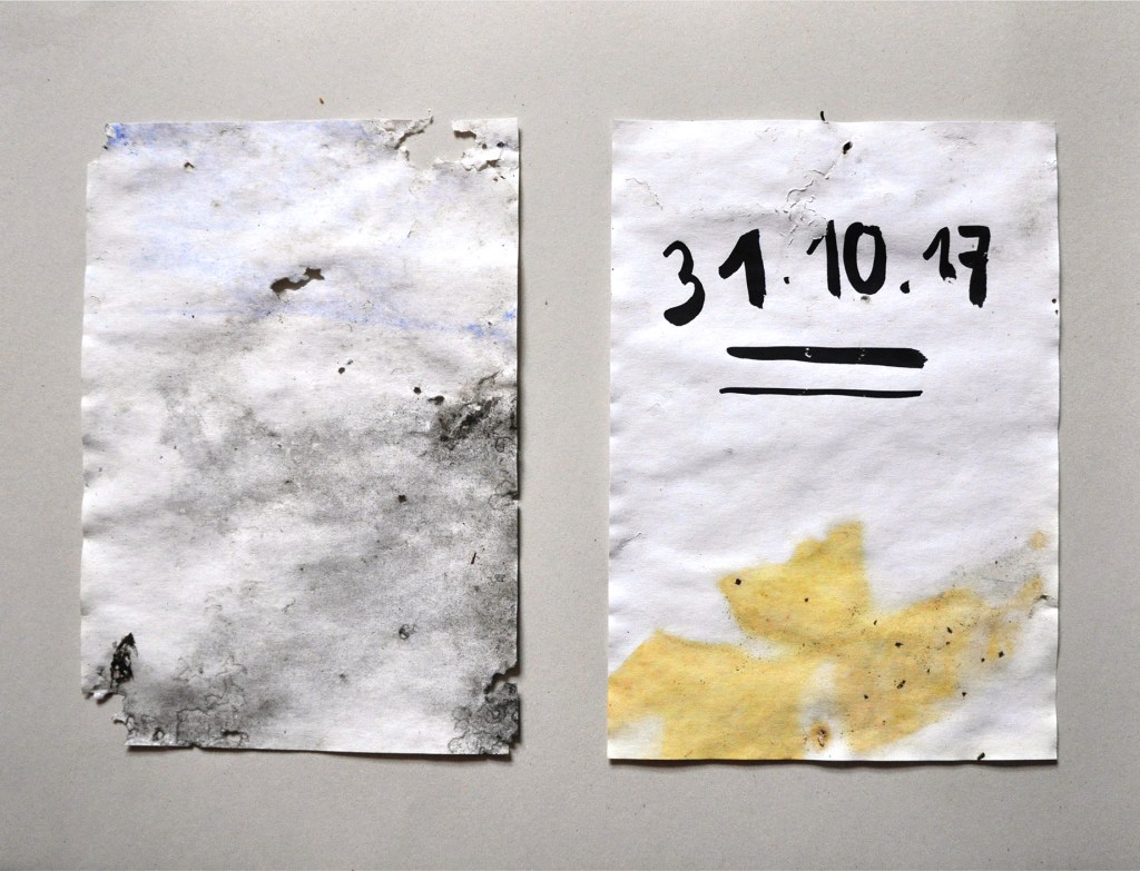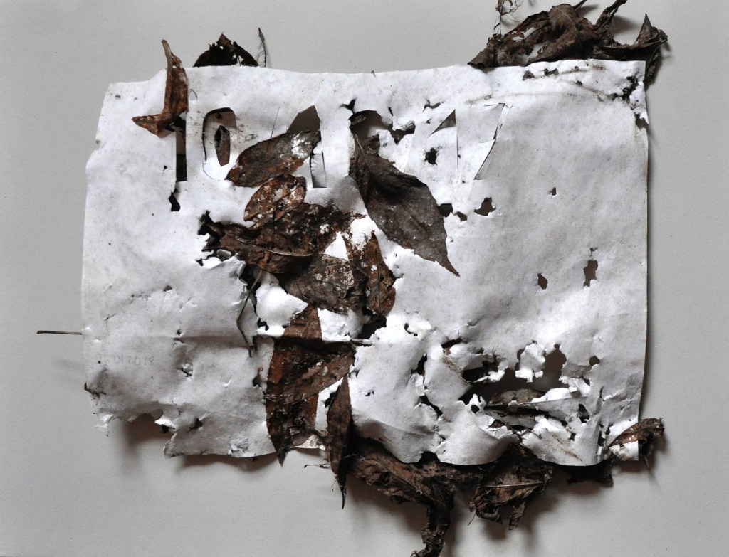 Another series engages less of the observer in revealing the tactility of rain, whose residual humidity engraves rotting leaves on the paper whose structure can be altered, e.g. by successive frosts and slugs’ hunger. The ownership of these creations is shared with the garden to which I modestly presented some prompts to recompose and expand. The dates written or cut on the sheet add a temporal dimension to this slow process of alteration spanning over wintery months.