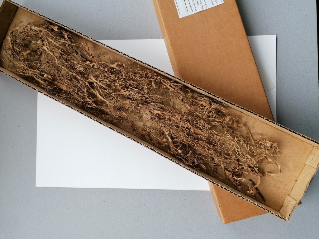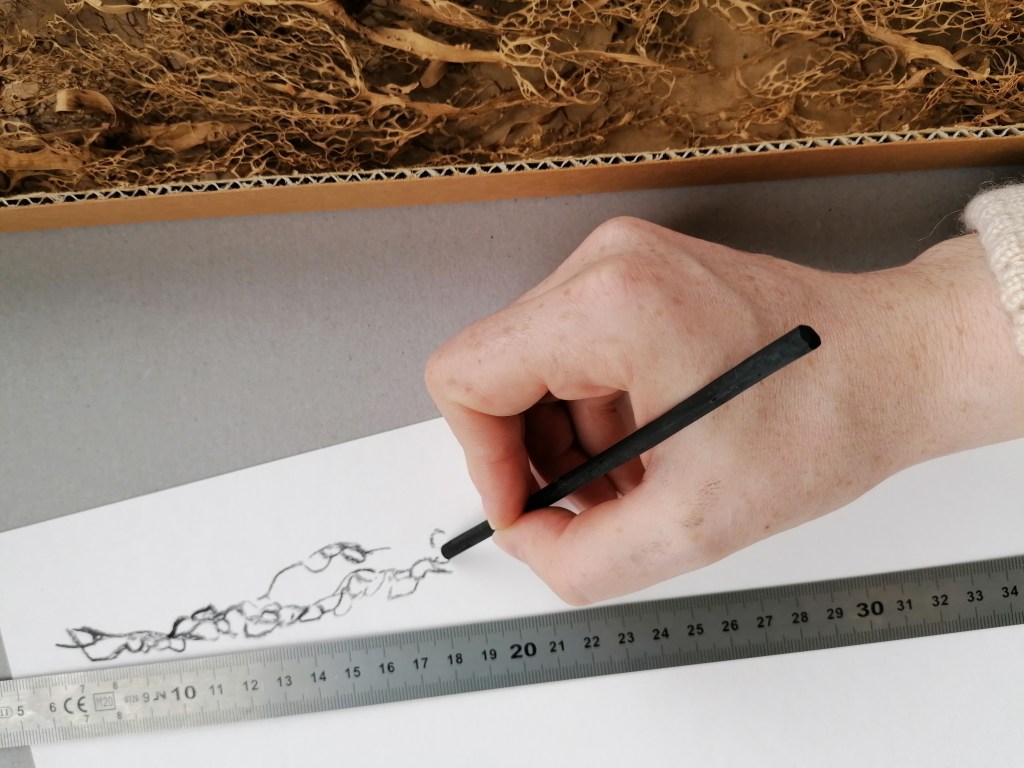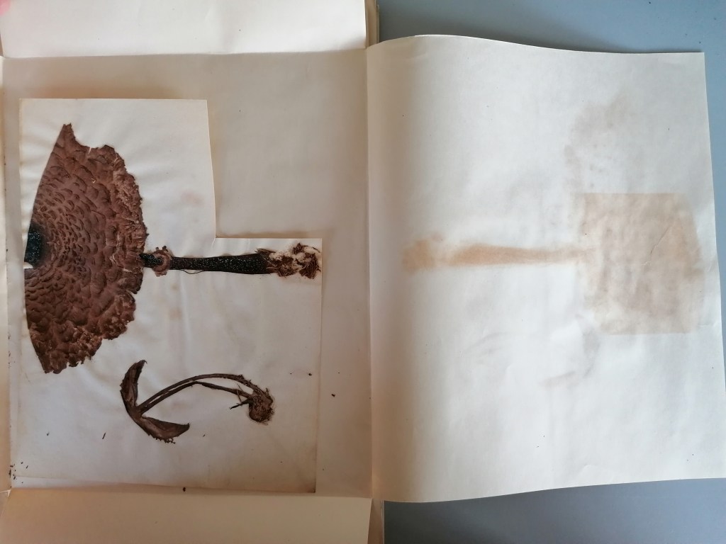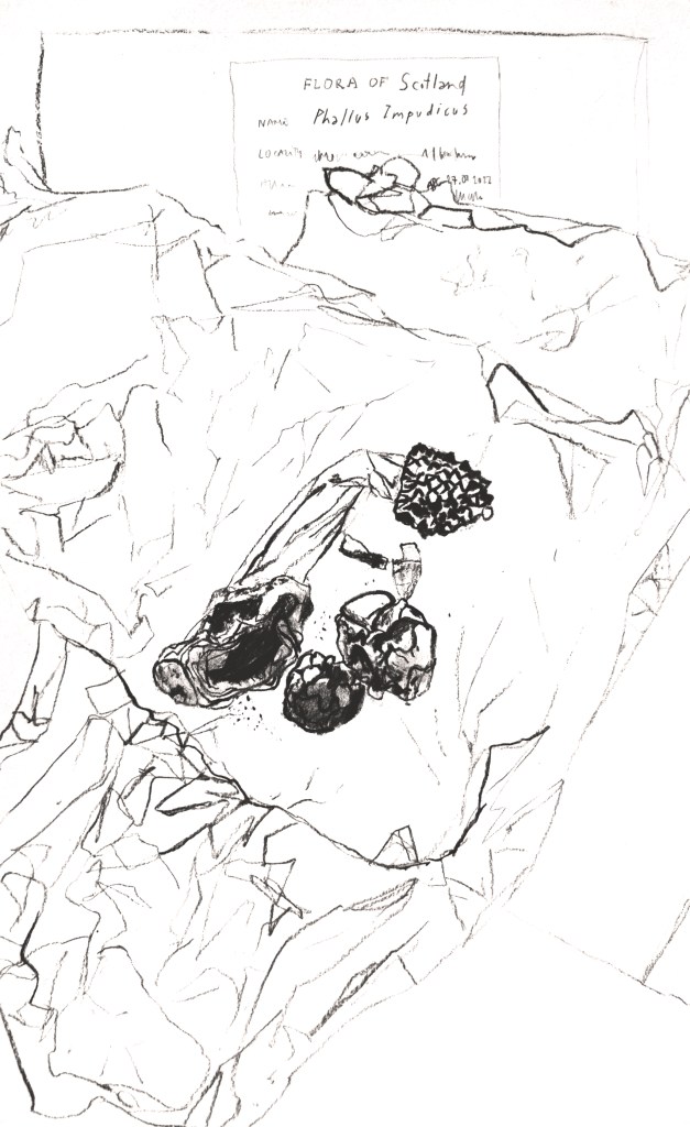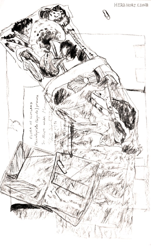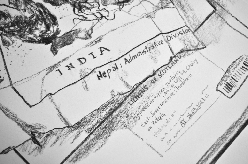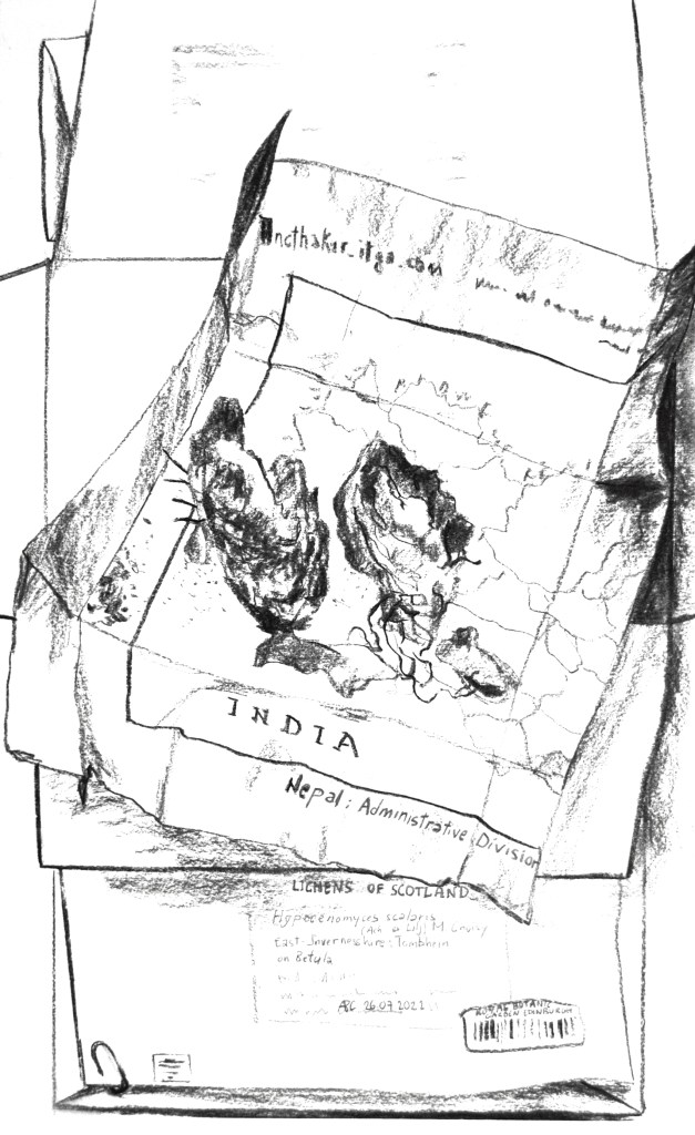 Preserved in the Herbarium cabinets, dried and mounted on archival boards, specimens await researchers to bring them out. Fungi are particularly challenging to store in the cabinets whether too small or too long or voluminous. In addition, they are a choice cut for beetles–curators’ enemy n˚1. Improvised wrapping and tailored protective strategies tell stories of care evolving over time for these unfitting lifeforms. The series uses actual (discarded) boards, which is the standard format specimens have to comply with to enter the collection, echoing complex Funga’s history with botany. Drawn with charcoal, frail lines and shading depict the fragility and stories enclosed in the cabinets.