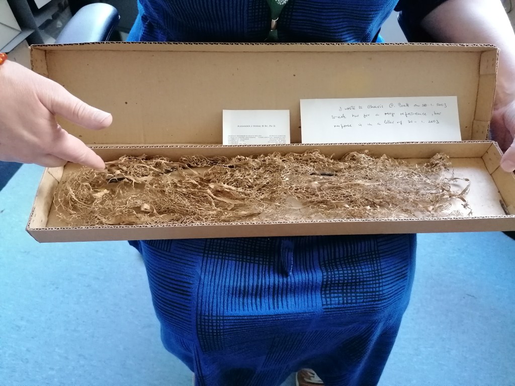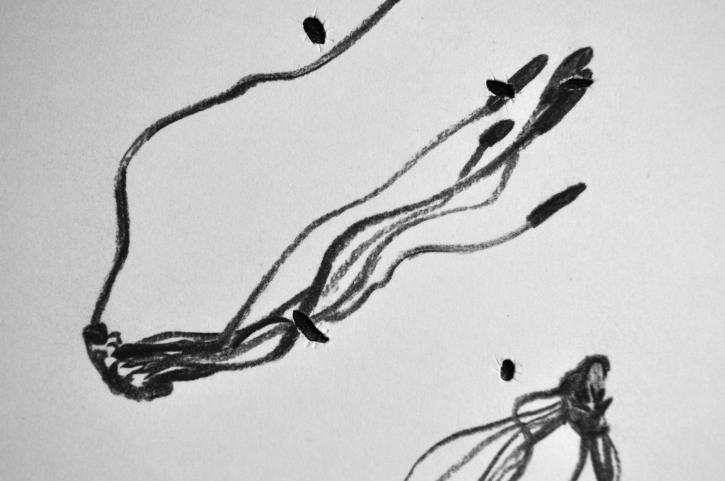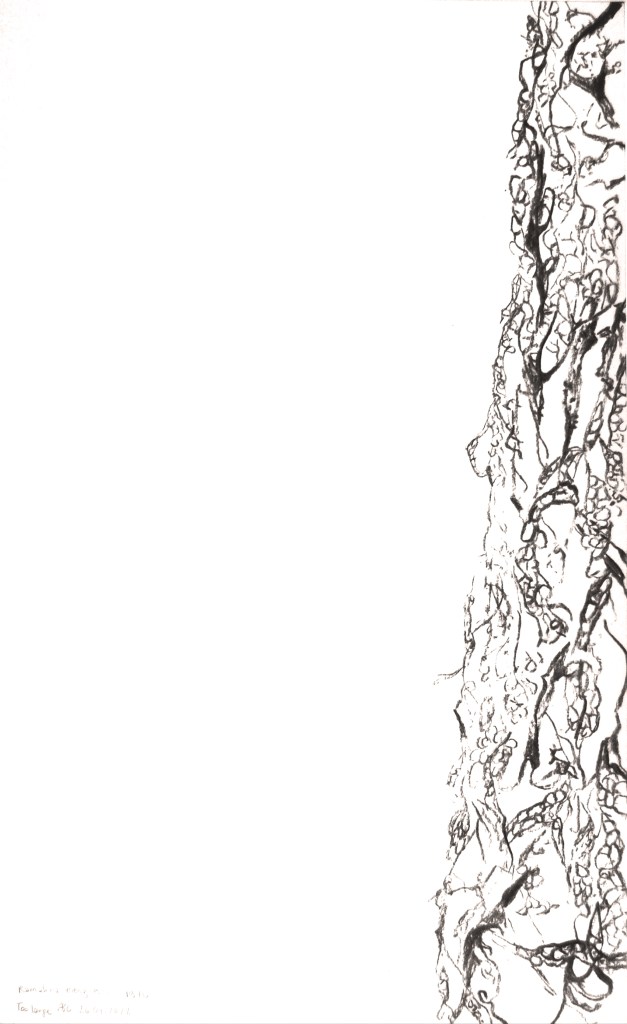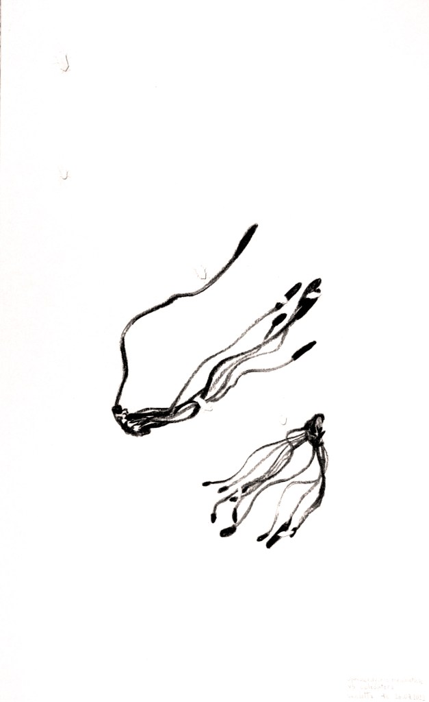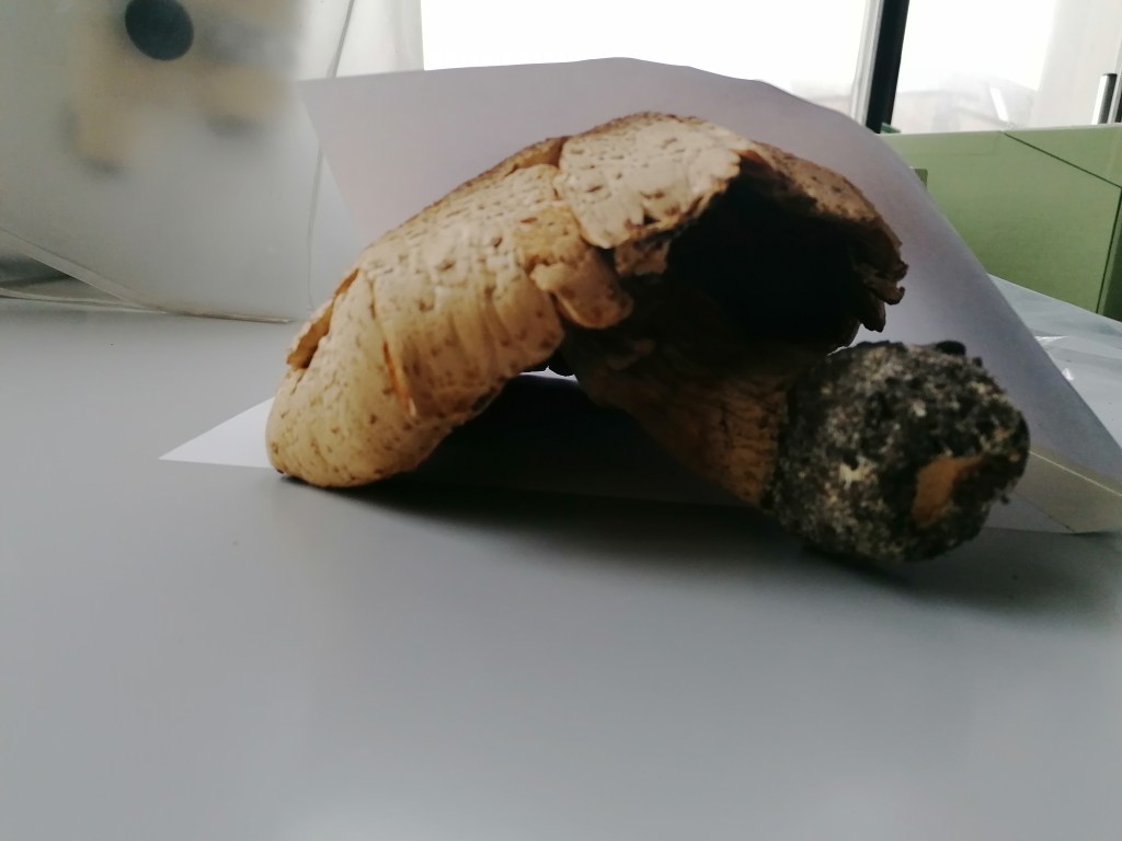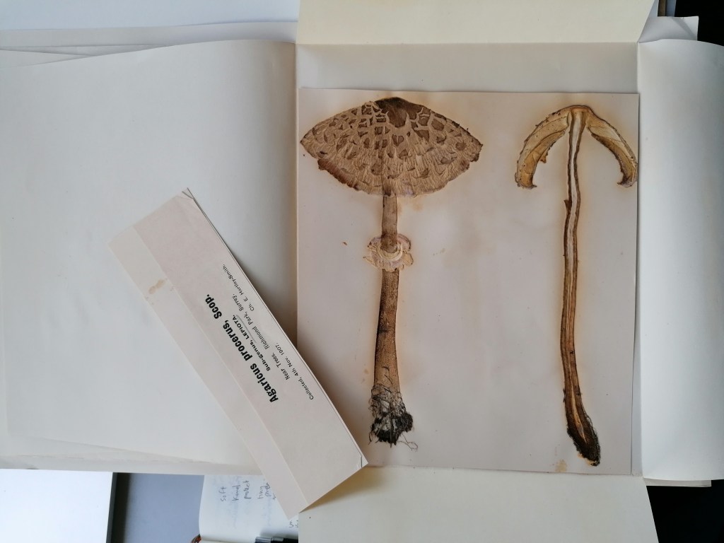 Preserved in the Herbarium cabinets, dried and mounted on archival boards, specimens await researchers to bring them out. Fungi are particularly challenging to store in the cabinets whether too small or too long or voluminous. In addition, they are a choice cut for beetles–curators’ enemy n˚1. Improvised wrapping and tailored protective strategies tell stories of care evolving over time for these unfitting lifeforms. The series uses actual (discarded) boards, which is the standard format specimens have to comply with to enter the collection, echoing complex Funga’s history with botany. Drawn with charcoal, frail lines and shading depict the fragility and stories enclosed in the cabinets.