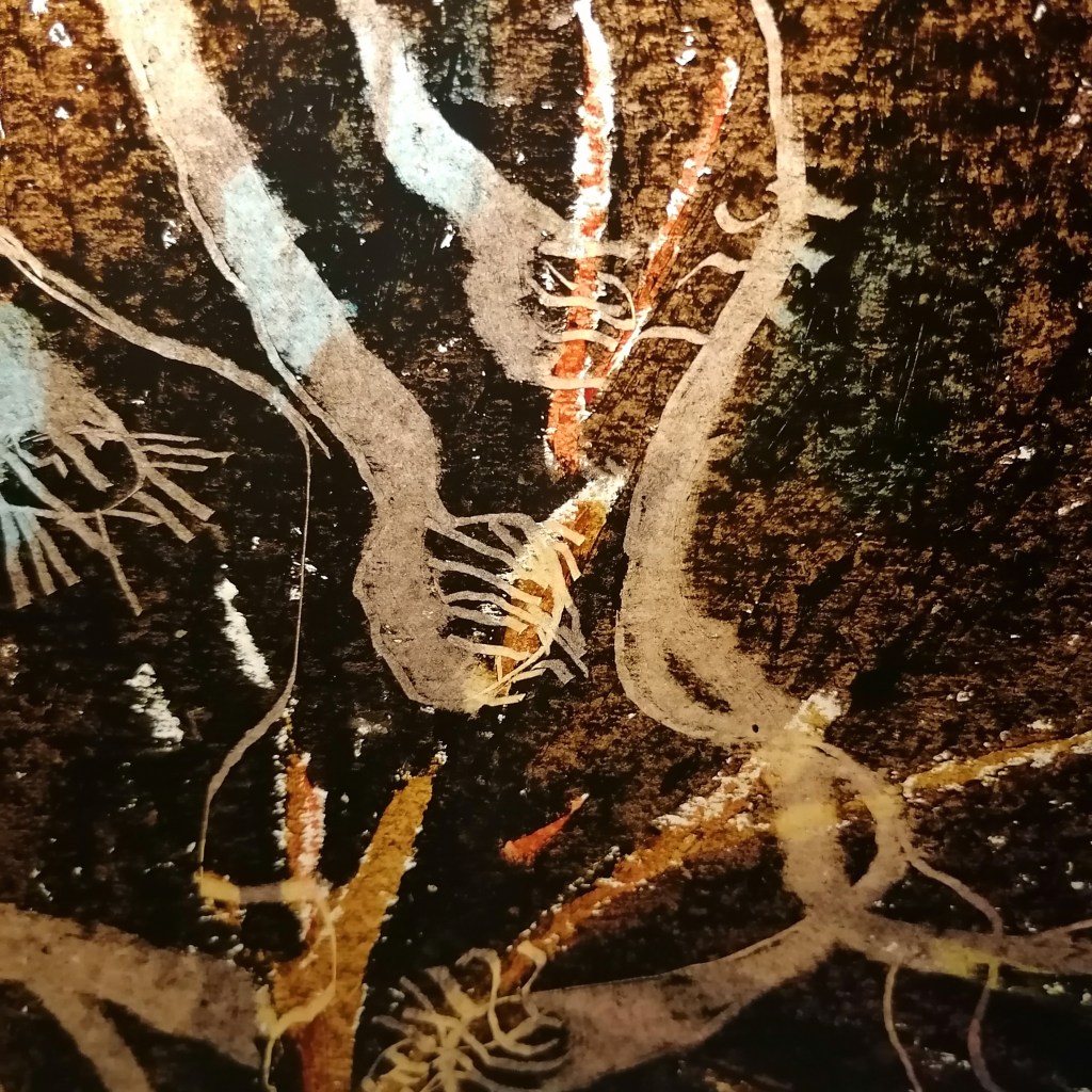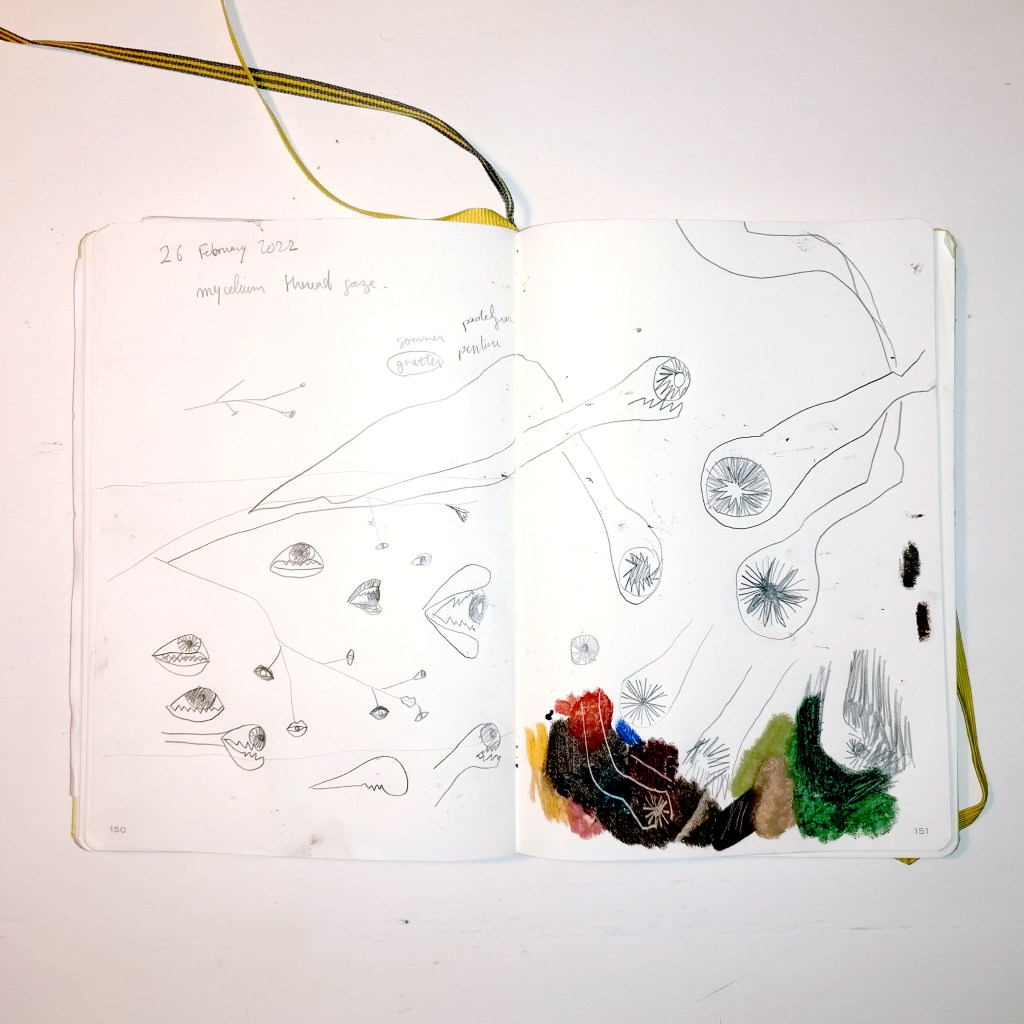 A speculative drawing echoing a conversation with a maker of stuffed fungi among other figurines from the herbarium. If I had to put eyes on a fungus, it would be at the tip of mycelium’s filaments that foray into the soil in search of nutrients. Fungi’s gaze searches the underground out of cellular sentience. As humans we experience the world through our senses, similarly to animals we relate to eyes. Still, are fungi any less relatable because of their peculiar sentience?