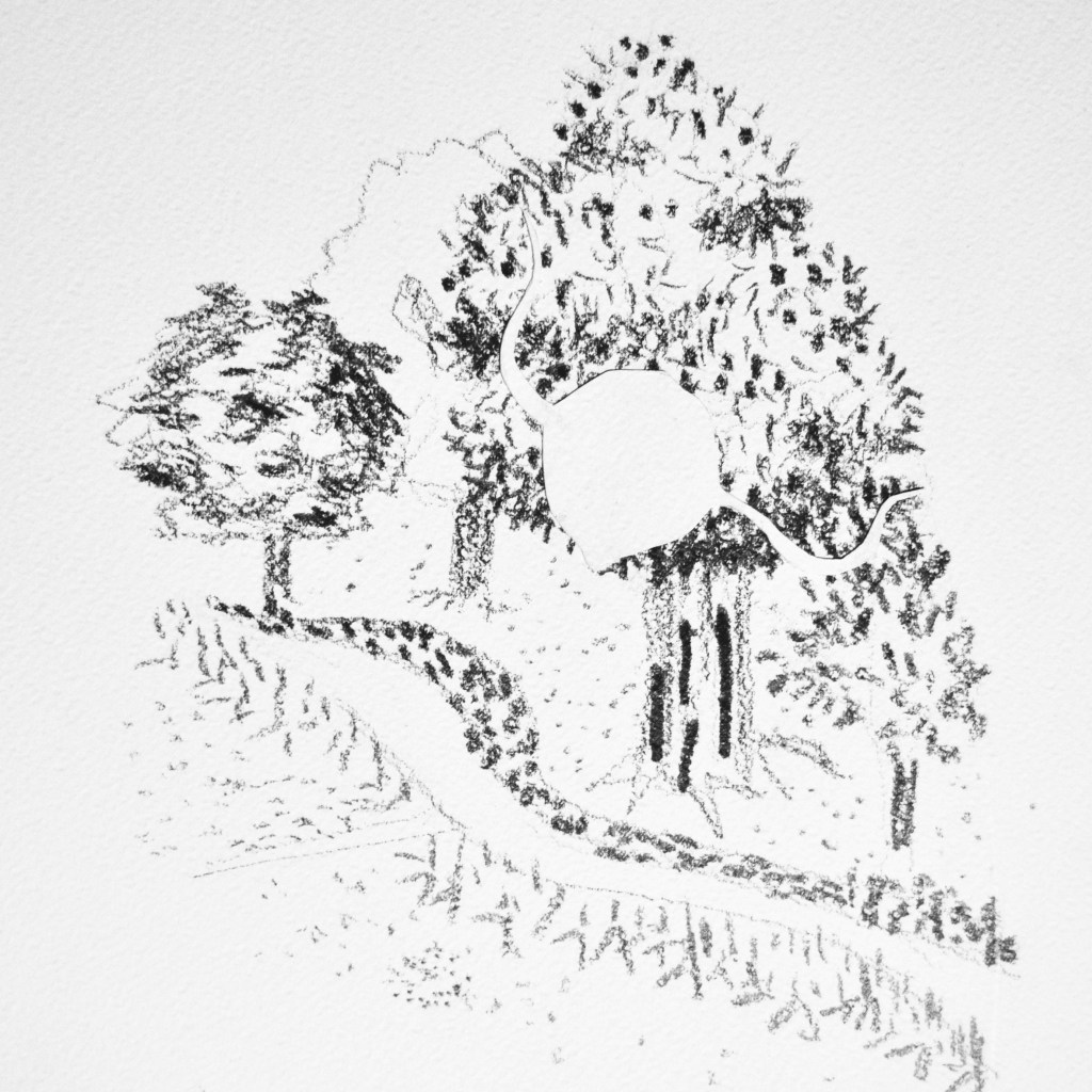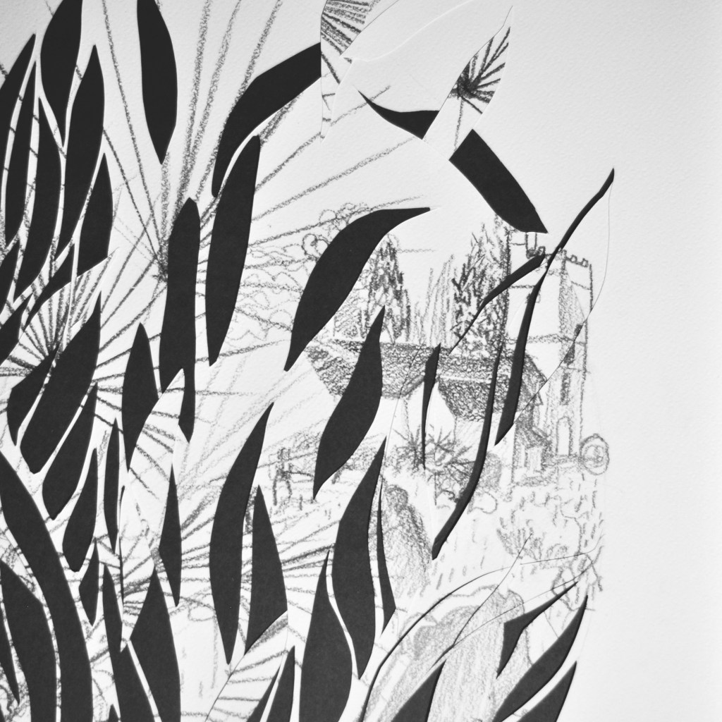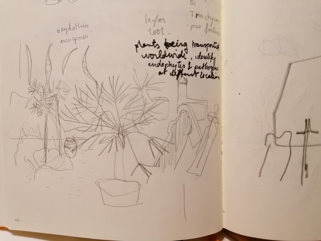 Conversations with micro-fungi specialists of RBGE have emphasized the consequences of the worldwide movement of plants over centuries of botanical and economical exchanges: plants have brought micro-organisms living within them such as symbiotic endophytes or parasites and pathogens. Conceived as a diptych, each illustration scales up the biological luggage of plants through their characteristic spores and reproductive structures. Oxydothis endophytes specific to palm tree Trachycarpus fortunei originate from China and are now found worldwide, including in Cornwall graveyards. Phytophthora ramorum, meaning ‘plant destroyer’ in Greek, is a severe plant disease, which does not cause much trouble in its original habitat, though when brought into other ecosystems it can attack weakened trees, thus bleeding out through the bark. Illustrations of those shuffled plant habitats dialogue with paper-cut micro-organisms like specific windows a researcher may look through to understand the world.