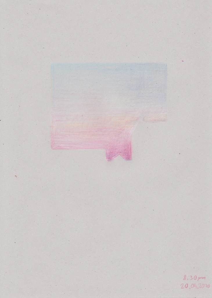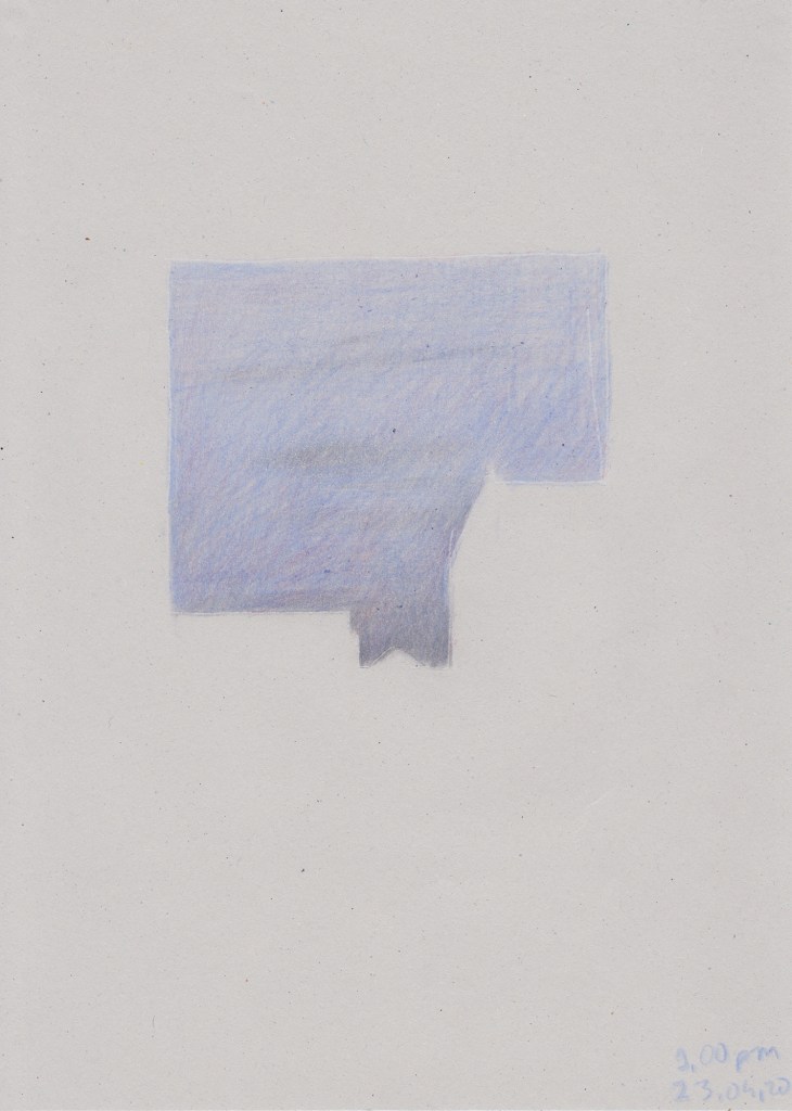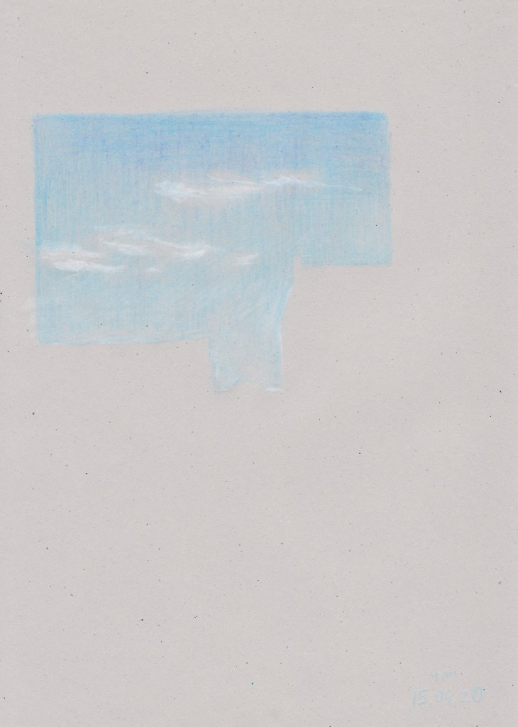 I gave myself the exercise to draw the sky the most faithfully to what my eyes perceive: lights and colours, textures and depths. Although, I soon realised the elements don’t wait for my hands to lay down their special composition, and so the exercise often failed to my own temporality. Room light may betray the shades I believe to be putting on paper or the sun may dazzle me.
